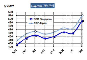 나프타(Naphtha)는 500달러를 넘어서는 폭등세를 나타냈다. 나프타 가격은 9월8일 CFR Japan 톤당 510달러로 37달러 폭등했고 FOB Singapore 역시 495달러로 36달러 올랐다. 표, 그래프: <Naphtha 가격추이> <화학저널 2017/09/15> |