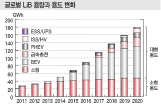 대형용도는 전기자동차(EV), 플러그인하이브리드자동차(PHEV) 등 차세대 친환경 자동차와 ESS(Energy Storage System), UPS(Uninterruptible Power Supply) 등 전력저장 분야에서 사용되며 앞으로 LiB 시장 성장을 견인할 것으로 기대된다.