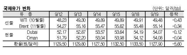 9월19일 국제유가는 미국의 원유 재고 증가 전망 등으로 하락했다. 9월19일 국제유가는 미국의 원유 재고가 증가한 것으로 파악됨에 따라 하락했다. 표, 그래프: <국제유가 변화> <화학저널 2017/09/20> |
