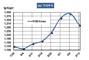 SM(Styrene Monomer)은 폭락세 전환이 불가피했다. SM 가격은 9월15일 FOB Korea 톤당 1297달러로 92달러 폭락했고 CFR SE Asia도 1307달러로 92달러 떨어졌다. CFR India 역시 92달러 폭락해 1338달러를 형성했다. 표, 그래프: <SM 가격추이> <화학저널 2017/09/20> |
