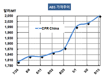 ABS(Acrylonitrile Butadiene Styrene)는 초강세 행진을 계속했다. ABS 가격은 9월13일 CFR China 톤당 2050달러로 40달러 상승했고 CFR SE Asia도 2070달러로 40달러 올랐다. 표, 그래프: <ABS 가격추이> <화학저널 2017/09/20> |