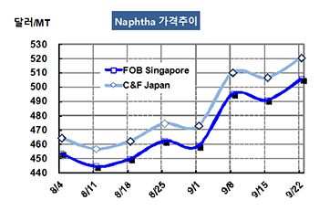 나프타(Naphtha)는 국제유가를 타고 500달러대 강세를 이어갔다. 나프타 가격은 9월22일 CFR Japan 톤당 520달러로 13달러 상승했고 FOB Singapore 역시 506달러로 15달러 올랐다. 표, 그래프: <Naphtha 가격추이> <화학저널 2017/09/25> |
