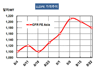 LLDPE(Linear Low-Density Polyethylene)는 1200달러가 무너졌다. LLDPE 가격은 9월20일 CFR FE Asia 톤당 1180달러로 20달러 하락했고 CFR SE Asia도 1200달러로 20달러 떨어졌다. 하지만, C6 메탈로센(Metallocene) 베이스 LLDPE는 FEA가 1250달러, SEA는 1270달러로 변동이 없었다. 표, 그래프: <LLDPE 가격추이> <화학저널 2017/09/25> |