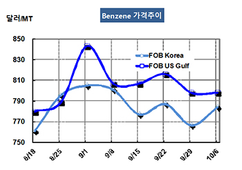 벤젠(Benzene)은 초강세 현상이 좀체 누그러지지 않고 있다. 벤젠 가격은 10월6일 FOB Korea 톤당 784달러로 17달러 상승했고 FOB SE Asia는 779달러로 12달러 올랐다. 표, 그래프: <Benzene 가격추이> <화학저널 2017/10/11> |