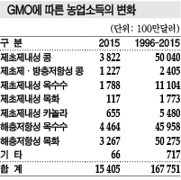 유전자재조합작물(GMO)이 농업소득 확대, 지구온난화 방지 등에 크게 기여하고 있다. 표, 그래프: <GMO에 따른 농업소득의 변화> <화학저널 2017년 10월 16일> |