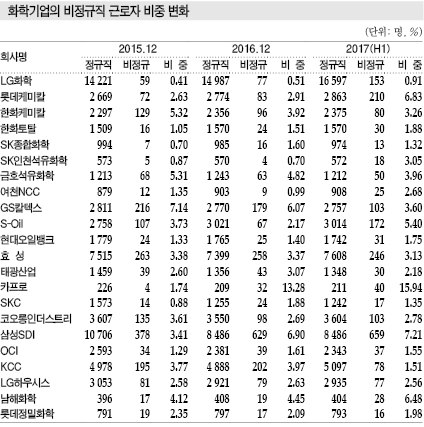 일부 화학기업들이 정규직 전환 추세에 역행해 비정규직 근로자를 늘리고 있다.