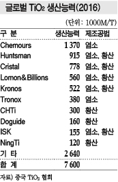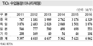 중국은 황산공법 공장이 많아 환경규제에 취약한 편이며 2016년부터 가동률이 하락해 TiO2 생산량이 감소하고 있다.