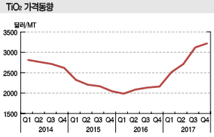 루타일형 TiO2 가격은 2011년 말부터 글로벌 수급타이트가 심화되며 톤당 4000달러 이상으로 상승한 후 2012년 하반기부터 하락했으나 2016년 1/4분기 또다시 수급타이트가 발생하면서 상승하기 시작해 2017년에는 3000달러 수준으로 전년대비 1000달러 이상 상승한 것으로 나타나고 있다.