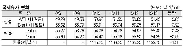 10월13일 국제유가는 중국의 9월 원유 수입 증가, 이라크 중앙정부와 쿠르드자치정부(KRG)의 갈등 심화, 미국의 원유 시추리그 수 감소 등으로 상승했다. 10월13일 국제유가는 중국이 9월 원유 수입을 늘림에 따라 상승했다. 표, 그래프: <국제유가 변화> <화학저널 2017/10/16> |