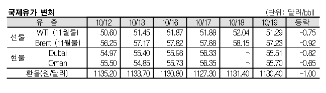 10월19일 국제유가는 미국의 석유제품 재고 증가, 나이지리아의 원유 수출 증가 가능성 등으로 하락했다. 10월19일 국제유가는 미국의 석유제품 재고가 증가한 영향으로 상승했다. 표, 그래프: <국제유가 변화> <화학저널 2017/10/20> |