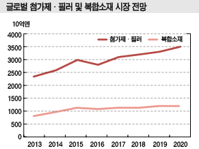 Fuji Kimera 연구소는 기계적 개선 및 전기적 기능, 열적 기능, 내후·광적 기능의 부여, 가교·중합 등을 목적으로 사용하는 첨가제·필러 43개 및 복합소재 7개 품목을 대상으로 조사한 「2017년 고기능 첨가제 및 하이브리드 재료의 현상과 미래 전망」 보고서를 발표하고 세계 첨가제·필러 시장이 글로벌 경제 성장과 동시에 자동차 분야 등에서 금속대체 등을 위한 수지의 고기능화 진전에 따라 2020년 3조4977억엔으로 2016년에 비해 22.8% 확대될 것으로 예측했다.