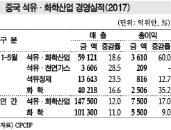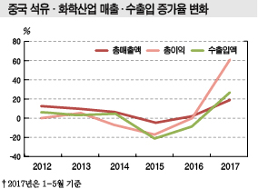 중국 화학산업은 성장을 멈추지 않고 있다. 표, 그래프: <중국 석유·화학산업 매출·수출입 증가율 변화, 중국 석유·화학산업 경영실적(2017)> <화학저널 2017년 10월 23일> |