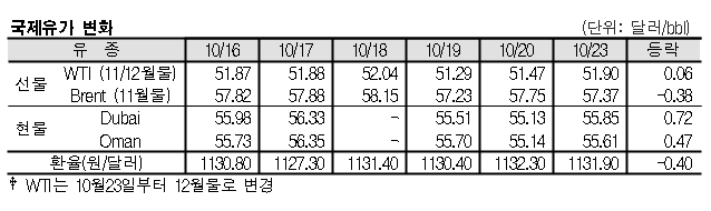 10월23일 국제유가는 브렌트유(Brent) 기준으로 미국의 이라크 정부에 대한 갈등 해결 촉구, 미국 달러화 강세 등으로 하락했다. 10월23일 국제유가는 미국이 이라크 정부에게 갈등 해결을 촉구한 영향으로 하락했다. 표, 그래프: <국제유가 변화> <화학저널 2017/10/24> |