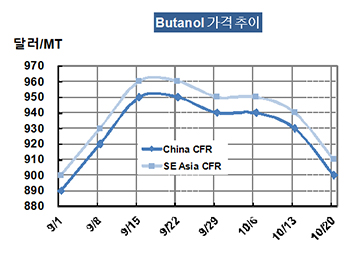 부탄올(n-Butanol)은 급락세로 전환됐다. 부탄올 가격은 10월20일 CFR China 톤당 900달러로 30달러 급락했고 CFR SE Asia도 910달러로 30달러 떨어졌다. 표, 그래프: <Butanol 가격추이> <화학저널 2017/10/26> |