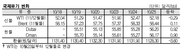 10월25일 국제유가는 브렌트유(Brent) 기준으로 사우디의 감산기간 연장 관련 발언, 이라크 중앙중부와 쿠르드(KRG) 자치정부의 갈등 고조, 미국 달러화 약세 등으로 상승했다. 10월25일 국제유가는 사우디가 감산기간 연장 의사를 시사한 영향으로 상승했다. 표, 그래프: <국제유가 변화> <화학저널 2017/10/26> |