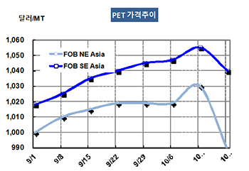 PET(Polyethylene Terephthalate)는 폭락세로 전환됐다. Bottle 그레이드 PET 가격은 10월20일 FOB NE Asia 톤당 989달러로 41달러 폭락했고 CFR SE Asia도 1040달러로 15달러 하락했다. 표, 그래프: <PET 가격추이> <화학저널 2017/10/26> |