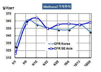 메탄올 가격은 10월20일 CFR Korea 톤당 350달러로 10달러 하락했으나 CFR SE Asia는 363달러로 3달러 상승했다. 특히, CFR China는 341달러로 8달러 올랐다. 하지만, CFR India는 310달러로 6달러 하락했다. 표, 그래프: <Methanol 가격추이> |