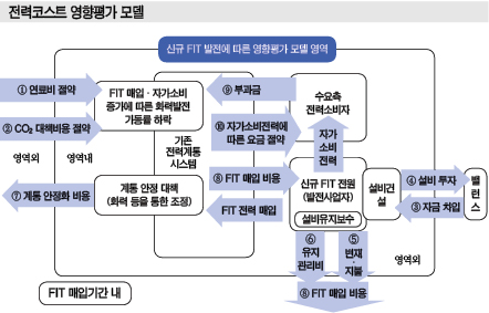 전력 코스트 영향평가 모델은 발전 사업, 송배전 사업, 소매 사업, 도매시장 등 기존 전력계통 시스템과 신규 FIT 전원 및 수요 측을 하나의 영역에 포함하고 있다.