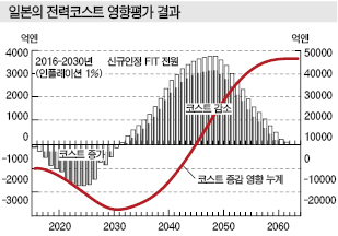 전력 코스트 영향평가 모델은 FIT 매입기간이 종료해도 가동을 지속한다는 것을 가정해 매입기간 종료 후도 평가 대상으로 파악하고 있으며 2016-2030년 동안 새롭게 FIT 인정을 받아 가동하는 FIT 전원이 포함돼 누계 설치량은 5000만kW로 추산되고 있다.