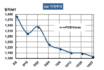 SM(Styrene Monomer)은 1200달러에서 멀어지고 있다. SM 가격은 10월27일 FOB Korea 톤당 1170달러로 18달러 하락했고 CFR SE Asia도 1181달러로 19달러 떨어졌다. 표, 그래프: <SM 가격추이> <화학저널 2017/11/01> |