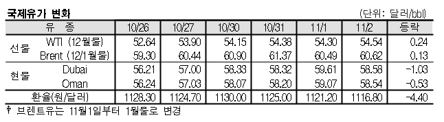 11월2일 국제유가는 사우디 에너지부 장관의 발언 영향으로 상승했다. 표, 그래프: <국제유가 변화> |