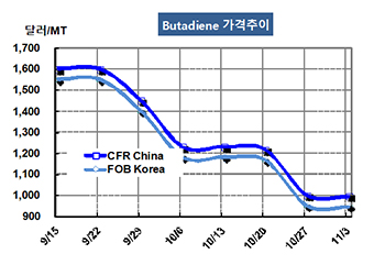 부타디엔(Butadiene)은 바닥에서 기어가고 있다. 부타디엔 가격은 11월3일 FOB Korea 톤당 945달러로 5달러 하락했고 CFR SE Asia도 945달러로 5달러 떨어졌다. CFR China도 995달러로 5달러 하락했다. 표, 그래프: <Butadiene 가격추이> <화학저널 2017/11/07> |