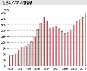 CCS 관련 각종 솔루션을 개발·제공하고 있는 주요 벤더의 매출동향에 따르면, 일본 CCS 시장규모는 2016년 약 415억엔으로 전년대비 5.4% 성장했다.