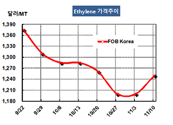 에틸렌(Ethylene)은 급등세로 전환됐다. 에틸렌 가격은 11월10일 FOB Korea 톤당 1250달러로 50달러 급등했으나 CFR SE Asia는 1160달러로 20달러 상승에 그쳤다. CFR NE Asia도 1300달러로 50달러 급등했다. 표, 그래프: <Ethylene 가격추이> <화학저널 2017/11/13> |