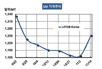 SM(Styrene Monomer)은 갑자기 폭등했다. SM 가격은 11월10일 FOB Korea 톤당 1252달러로 84달러 폭등했고 CFR SE Asia도 1268달러로 89달러 올랐다. CFR India 역시 1295달러로 84달러 폭등했다. 표, 그래프: <SM 가격추이> <화학저널 2017/11/15> |