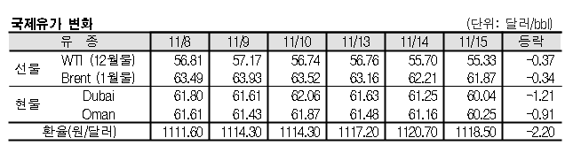 11월15일 국제유가는 미국의 원유 재고 증가와 생산량 증가, 국제에너지기구(IEA)의 글로벌 석유 수요 전망치 하향조정 등으로 하락했다. 11월15일 국제유가는 미국의 원유 재고가 증가한 영향으로 하락했다. 표, 그래프: <국제유가 변화> <화학저널 2017/11/16> |
