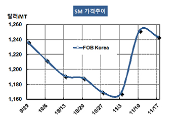 SM(Styrene Monomer)은 폭등의 후유증으로 하락했다. SM 가격은 11월17일 FOB Korea 톤당 1244달러로 8달러 하락했고 CFR SE Asia도 1260달러로 9달러 떨어졌다. CFR India 역시 9달러 하락해 1287달러를 형성했다. 표, 그래프: <SM 가격추이> <화학저널 2017/11/22> |