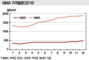 MMA 가격은 2016년 수급타이트 상태가 지속되는 가운데 원료가격도 계속 강세를 나타냄에 따라 상승세를 나타내고 있다.
