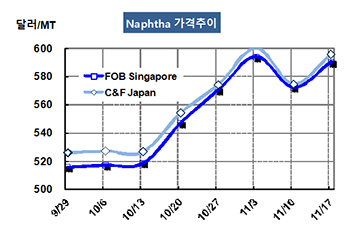 나프타(Naphtha)는 다시 600달러에 육박했다. 나프타 가격은 11월24일 CFR Japan 톤당 596달러로 21달러 급등했고 FOB Singapore도 590달러로 18달러 올랐다. 표, 그래프: <Naphtha 가격추이> <화학저널 2017/12/01> |