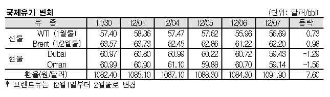 12월7일 국제유가는 나이지리아 석유노조가 파업을 선언한 영향으로 상승했다. 표, 그래프: <국제유가 변화> |