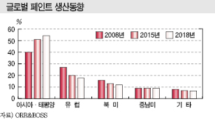 아시아·태평양 지역은 세계 전체 생산량의 54% 수준을 차지하고 있으나 판매액은 45%에 불과한 것으로 나타났다. 북미·유럽에 비해 단가가 낮은 페인트가 주류를 이루고 있기 때문이다.