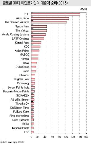 글로벌 메이저 30사는 대부분 페인트가 핵심사업으로 2015년에는 Sherwin Williams와 Nippon Paint가 인수합병(M&A)을 통해 새롭게 5위권에 진입했다.