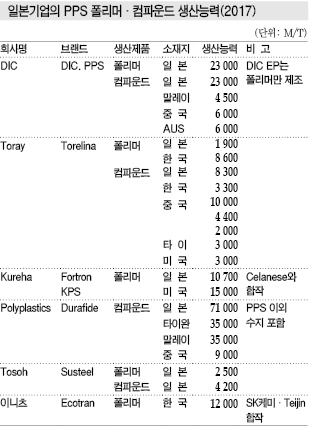 일본은 2016년 PPS 생산량이 3만7167톤으로 전년대비 4.1%, 판매량은 2만6423톤으로 3.3% 감소했다.