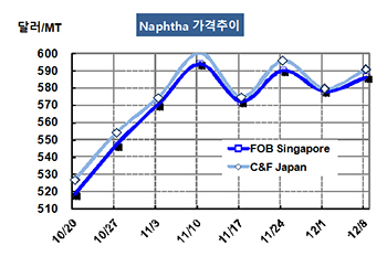 나프타(Naphtha)는 다시 600달러에 근접했다. 나프타 가격은 12월8일 CFR Japan 톤당 591달러로 11달러 상승했고 FOB Singapore 역시 586달러로 8달러 올랐다. 표, 그래프: <Naphtha 가격추이> <화학저널 2017/12/15> |