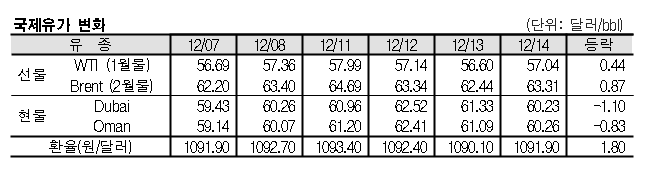 12월14일 국제유가는 북해 송유관 가동중단 여파 지속, IEA(국제에너지기구)의 2018년 석유 수급밸런스 전망, WTI(서부텍사스 경질유) 백위데이션 전환 등으로 상승했다. 12월14일 국제유가는 북해 송유관의 가동중단 여파가 지속됨에 따라 상승했다. 표, 그래프: <국제유가 변화> <화학저널 2017/12/15> |
