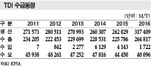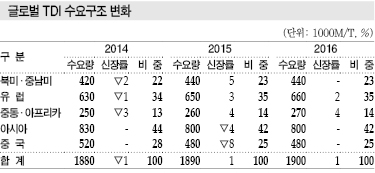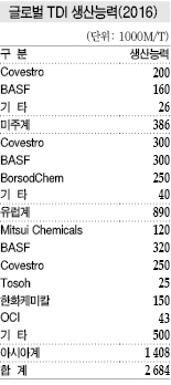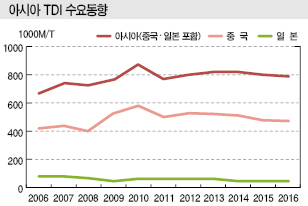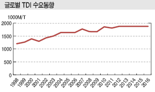 TDI는 글로벌 생산능력이 300만톤에 달하지만 실제 수요는 200만톤에 불과해 장기적인 적자생산에 시달린 것으로 알려졌다.