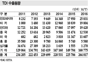 중국은 2013년 2만965톤으로 TDI를 가장 많은 수출한 국가였으나 2014년 9056톤으로 급감한 뒤 2015-2016년 1만톤 수준을 유지하는데 그쳤다.
