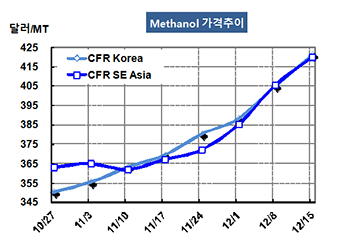 메탄올 가격은 12월15일 CFR Korea 톤당 421달러로 16달러 급등했고 CFR SE Asia 역시 420달러로 14달러 올랐다. CFR China는 411달러로 16달러 급등했고 CFR India는 415달러로 14달러 올랐다. 표, 그래프: <Methanol 가격추이> |