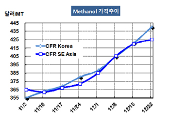 메탄올(Methanol)은 400달러대 중반으로 올라섰다. 메탄올 가격은 12월22일 CFR Korea 톤당 440달러로 19달러 급등했으나 CFR SE Asia는 425달러로 5달러 상승에 그쳤다. CFR China는 421달러로 10달러 올랐다. 표, 그래프: <Methanol 가격추이> <화학저널 2017/12/28> |