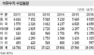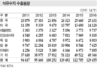 2016년 석유수지 수출량은 5만290톤으로 2% 줄어들었다.