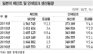인쇄잉크는 정보매체의 중심이 신문, 잡지 등 종이매체에서 스마트폰 등 전자매체로 전환되면서 2006년을 정점으로 시장이 계속 축소되고 있으며, 페인트는 생산량이 소폭 증가하고 있으나 석유수지 함유량이 많은 트래픽 페인트 생산량은 3년 연속 감소한 것으로 나타났다.
