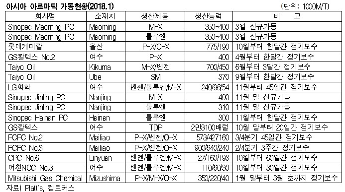 일본 Taiyo Oil은 Kikuma 소재 M-X 70만톤 및 벤젠 45만톤 플랜트를 6월부터 3개월간, Ube 소재 SM(Styrene Monomer) 37만톤 플랜트는 9월부터 한달간 정기보수할 방침이다. 표, 그래프: <아시아 아로마틱 가동현황(2018.1)> <화학저널 2018/01/17> |