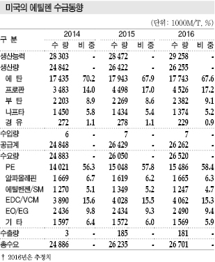 미국은 2017-2018년 가동 예정인 프로젝트의 에틸렌 생산능력이 총 813만톤으로 유도제품인 PE도 510만톤 확대할 것으로 예상되고 있다.