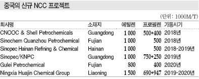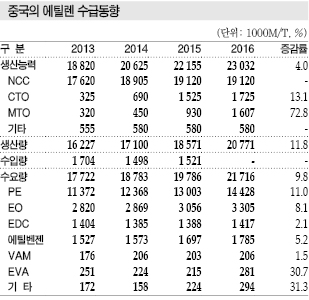 중국에서 신규 가동하는 에틸렌 생산설비는 CTO, MTO가 대부분이며 NCC는 증설만 이루어지고 있다. 다만, 2018년 이후에는 신규 NCC 건설이 진행될 것으로 예상되고 있다.