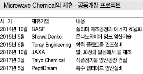 고부가가치 분야 탈피 … 에너지 소비에 설비코스트 대폭 감축 마이크로파를 사용한 화학 프로세스가 고부가가치 분야에 이어 범용화학에도 적용될지 주목된다. 표, 그래프: <Microwave Chemical의 제휴·공동개발 프로젝트> <화학저널 2018년 1월 22·29일> |