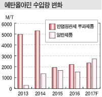 국내 에탄올아민(Ethanolamine) 시장은 KPX그린케미칼이 반덤핑 규제 연장을 신청해 이목이 집중되고 있다. 표, 그래프: <에탄올아민 수입량 변화, 에탄올아민 수입동향> <화학저널 2018년 1월 22·29일> |